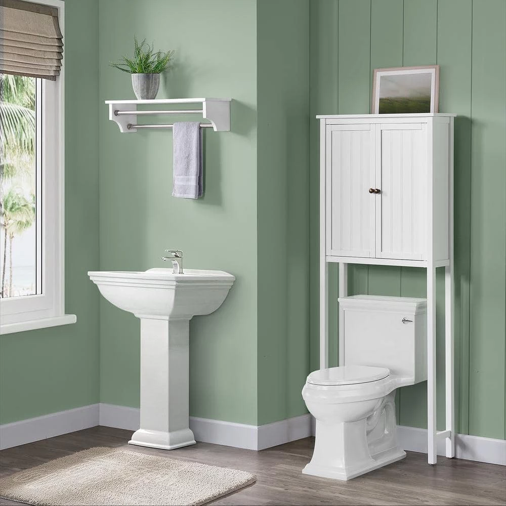 This collection brings space saving storage to your bathroom. The classic design compliments almost any bathroom decor. Wood construction with a white, painted finish, these pieces are designed for both style and functionality. A perfect space saver for your bathroom, over the toilet space saver hutch allows you to tuck away your toiletries behind 2-doors. The cabinet design offers ample storage. The cabinet features 2 adjustable shelves that are ideal for storing items of different sizes. The 27 in. W shelf provides space for decor or bathroom accessories and features 2 towel rods. Bath collection is moisture resistant.