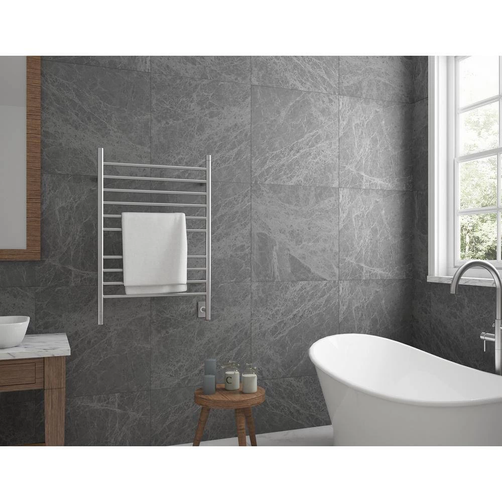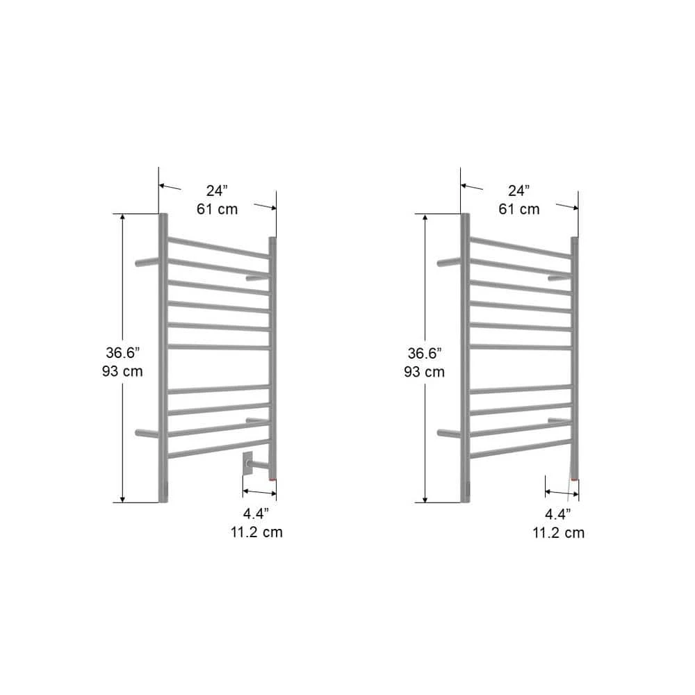Featuring Anconas exclusive energy-saving built-in timer, the Argenta warms up in minutes and can be programmed to operate for just the time you need (2, 4 or 6 hours). Beautiful in bathrooms and full of possibilities in the laundry room, exercise room, mudroom or bedroom, this towel warmer is an elegant and eco-friendly way to keep your towels and clothes dry, fresh and warm in any weather. Crafted in high-quality stainless steel with an elegant brushed finish, this 10-bar towel warmer can be installed on your wall with the discreet hardwire option or simply plugged into an existing outlet. The elegant and practical curved design allows you to easily dry or warm even the largest bath towels. Enjoy a spa-like luxury in your own home with the Ancona Argenta.
