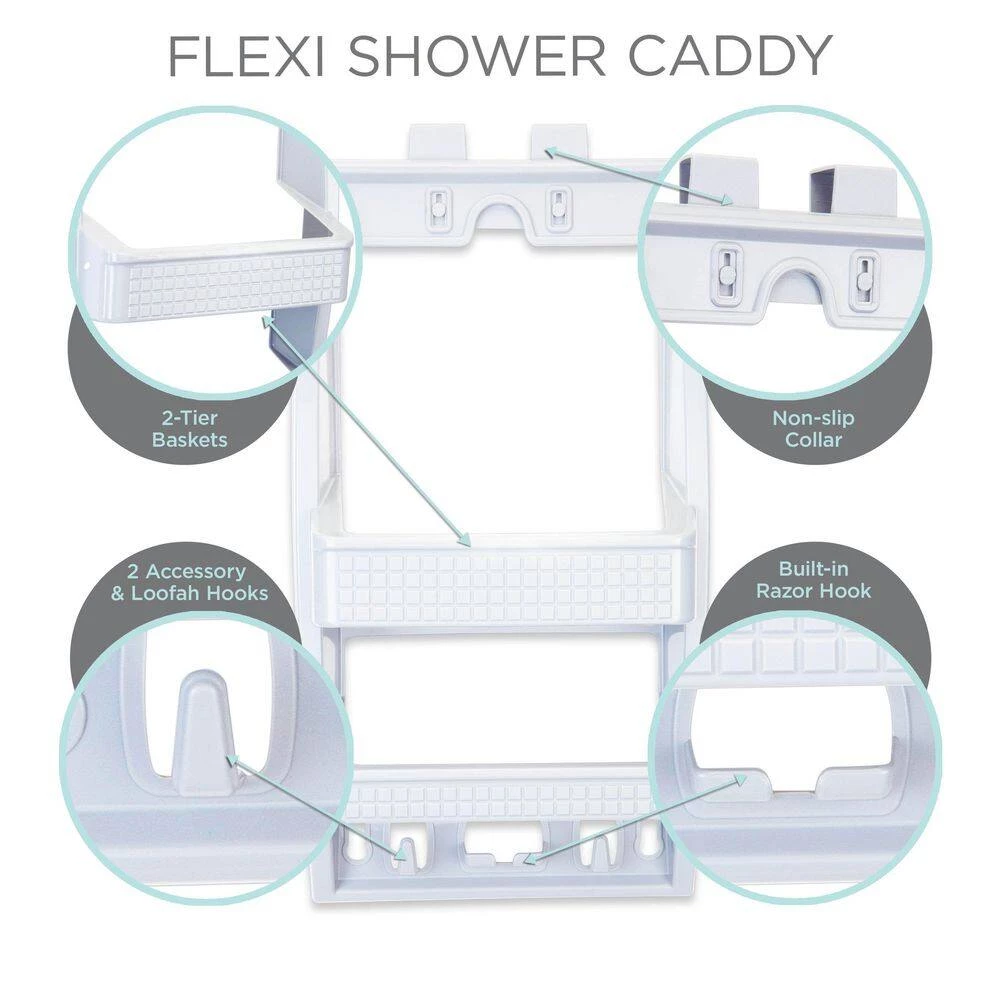 - 4-different hanging options: over the door, over the shower head, screw assembly and adhesive backing