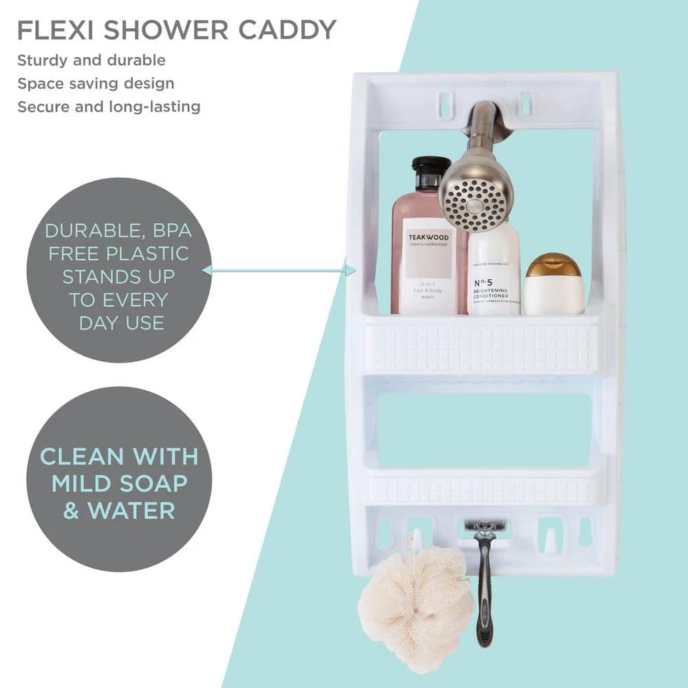 The perfect shower caddy for any shower style. The Bath Bliss multi use shower caddy will work with any bathroom. Designed with 4 options to hang, over the door, over the shower head, screw assembly and adhesive backing makes this a great addition to your shower for organization. Designed with 2 tier shelving that holds large bottles, 2 loofah hooks and a built in razor hook. Made BPA free to keep your home toxic free and safe.