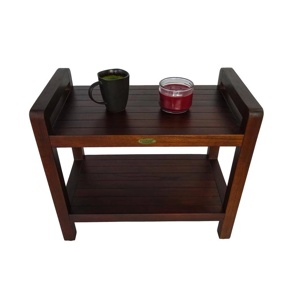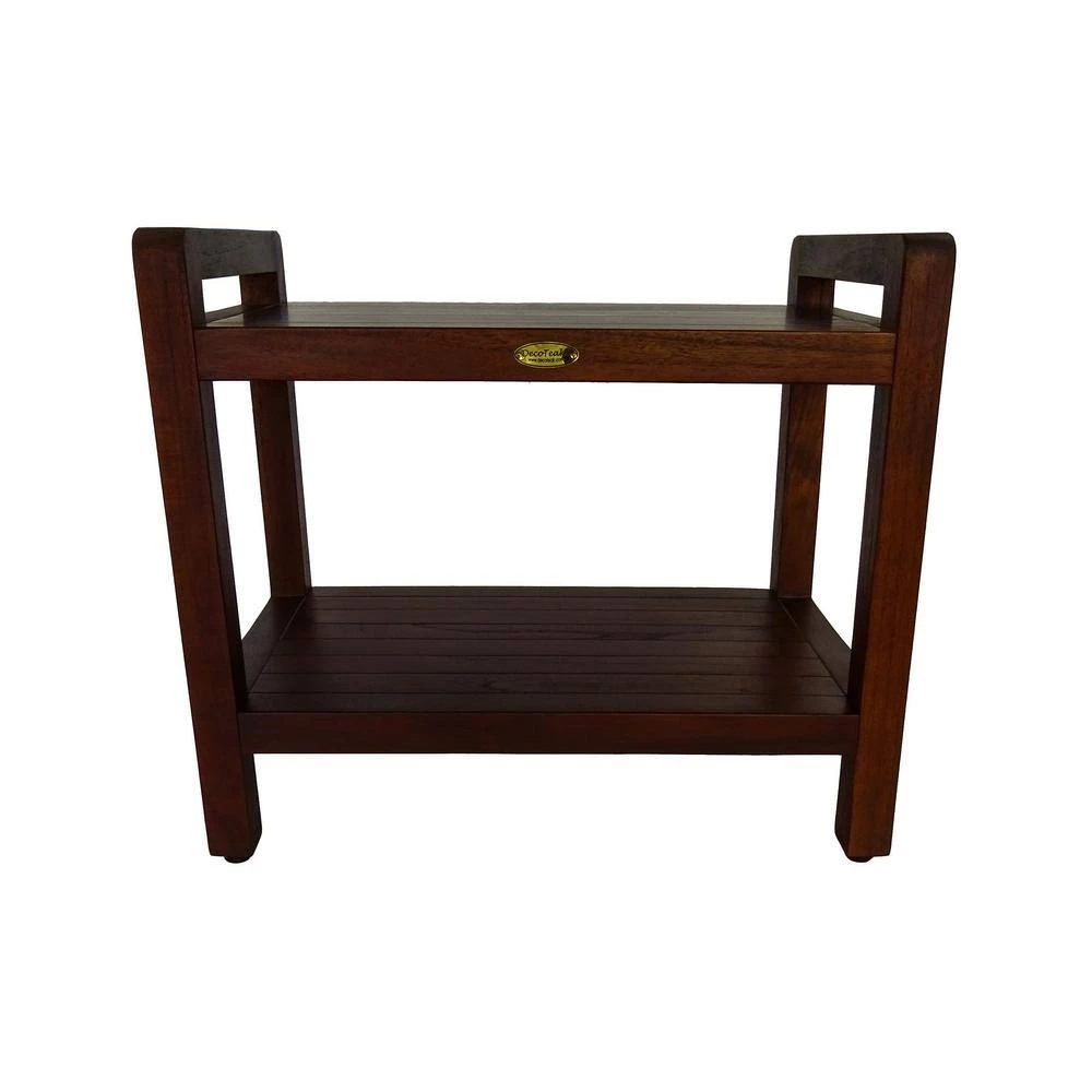 24 in. ergonomic teak shower bench with shelf. LiftAide arms provide support for lifting and sitting from shower chair. Solid teak with slats for water drainage. Adjustable foot pads provide height adjustment for sloped shower floors. Indoor outdoor mold and fungus resistant stain. Use as a shower bench, stool, or shower chair, or use outdoors or indoors. These shower benches have received kudos from healthy young adults, as well as those need a little extra support, mobility, and safety in the shower. Transitioning from standing to sitting is 1 of the most common tasks we do everyday, and also 1 of the most strenuous and physically demanding. Add water, and slippery shower surfaces and you will enjoy the added safety and protection of having support arms provide you. This is the first and only teak shower chair that provides these types of ergonomic and mobility benefits typically found in white plastic medical shower chairs. But DecoTeak shower benches are attractive and modern, and will compliment the most modern of bathrooms, as well as luxurious, while providing the same benefits as medical shower chairs. Some assembly is required, but all tools and hardware is provided, as well as complete instructions and assembly diagrams. All DecoTeak products are provided with a 30-day satisfaction guarantee as well as a 5-year limited warranty.