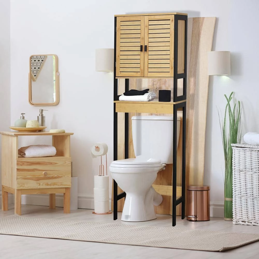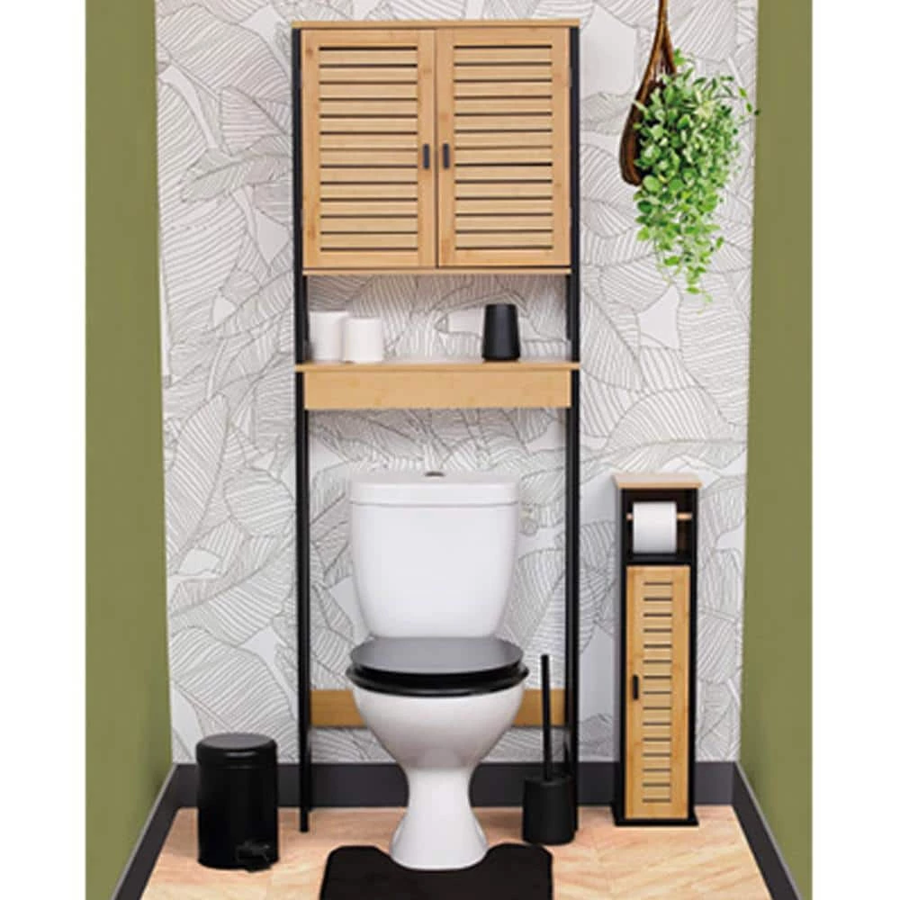Keep a perfectly organized bathroom and make the best use of limited space with some attractive bathroom storage solutions. This over-the-toilet cabinet bamboo and black features an open tray and an inside shelf that offer plenty of space for all your bathroom accessories. This is a perfect storage option and is typically designed to slide behind the toilet against a wall. Bathroom cabinets are a common choice for people looking to integrate some storage space into their bathroom. Freestanding cabinets are great for keeping items off the floor and at hand reach. Also ideal for holding towels and other accessories without taking up much floor space. A space saver placed over the toilet makes good use of a storage area that normally goes to waste. Perfect to store and dispense toilet paper rolls and provides an elegant addition to any bathroom with a modern look. Revamp and organize your bathroom with our Cebu over-the -toilet space saver cabinet.
