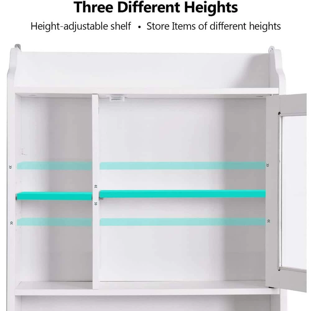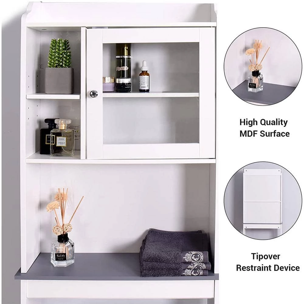 This is space-saving toilet cabinet, which allows you to utilize extra space for all your bathroom storage needs. This shelf is mainly constructed with white paint smooth panels and a black paint faux marble panel. External paint not only makes the toilet shelf more noble and beautiful, but also makes it moisture-proof. Solid and high quality MDF panels guarantee the fastness of the shelf. It supplies you with ample storage space including an enclosed shelf with a door made of glass and 1 open shelf to space a variety of functional and decorative bath items. What’s more, the laminates of open shelf and enclosed shelf are adjustable so that you can adjust the laminate to the height you need. This size of the toilet shelf matches most of the toilets. With this toilet shelf, your bathroom will be tidier and cleaner. If you are in need of such a toilet cabinet, please don’t hesitate to buy it.
