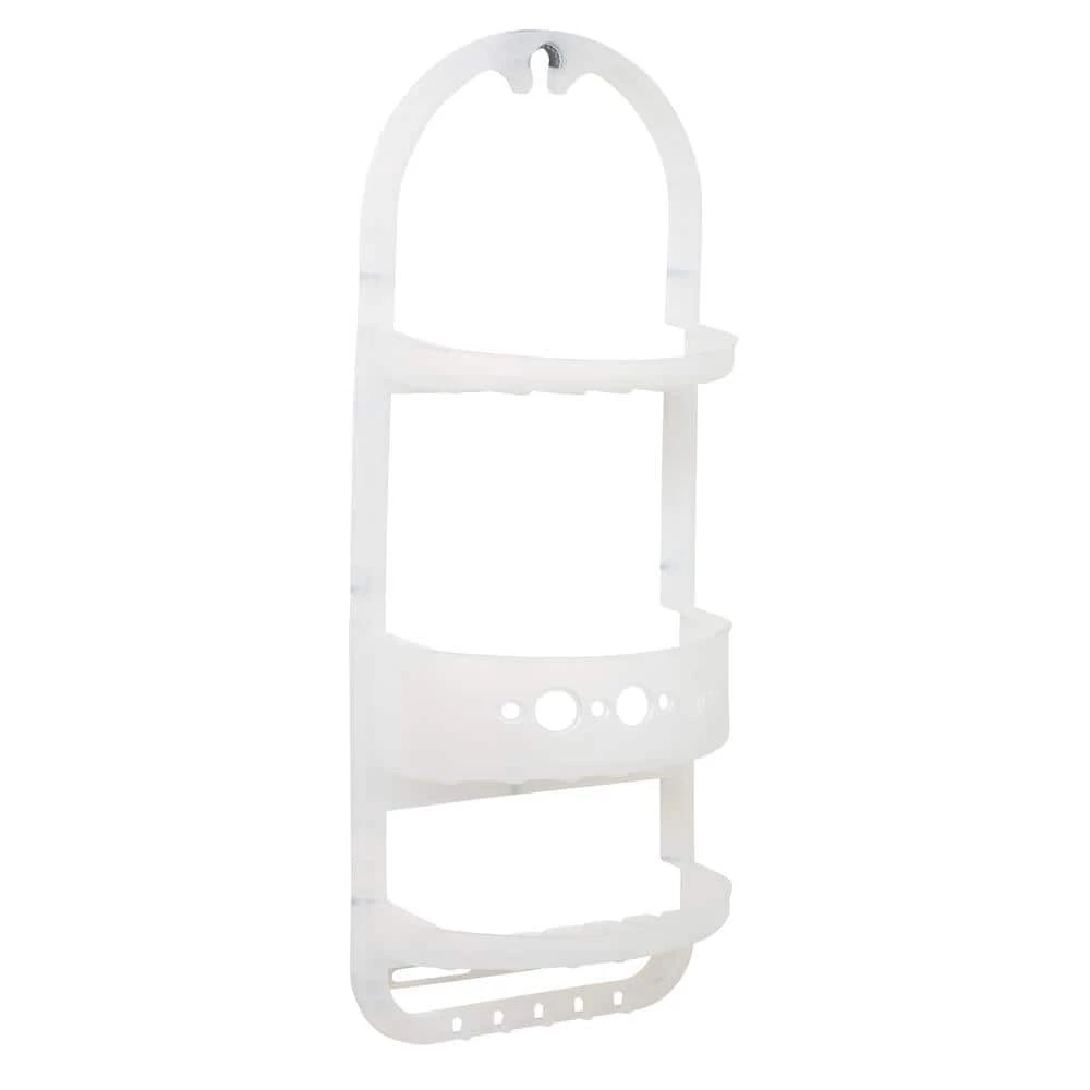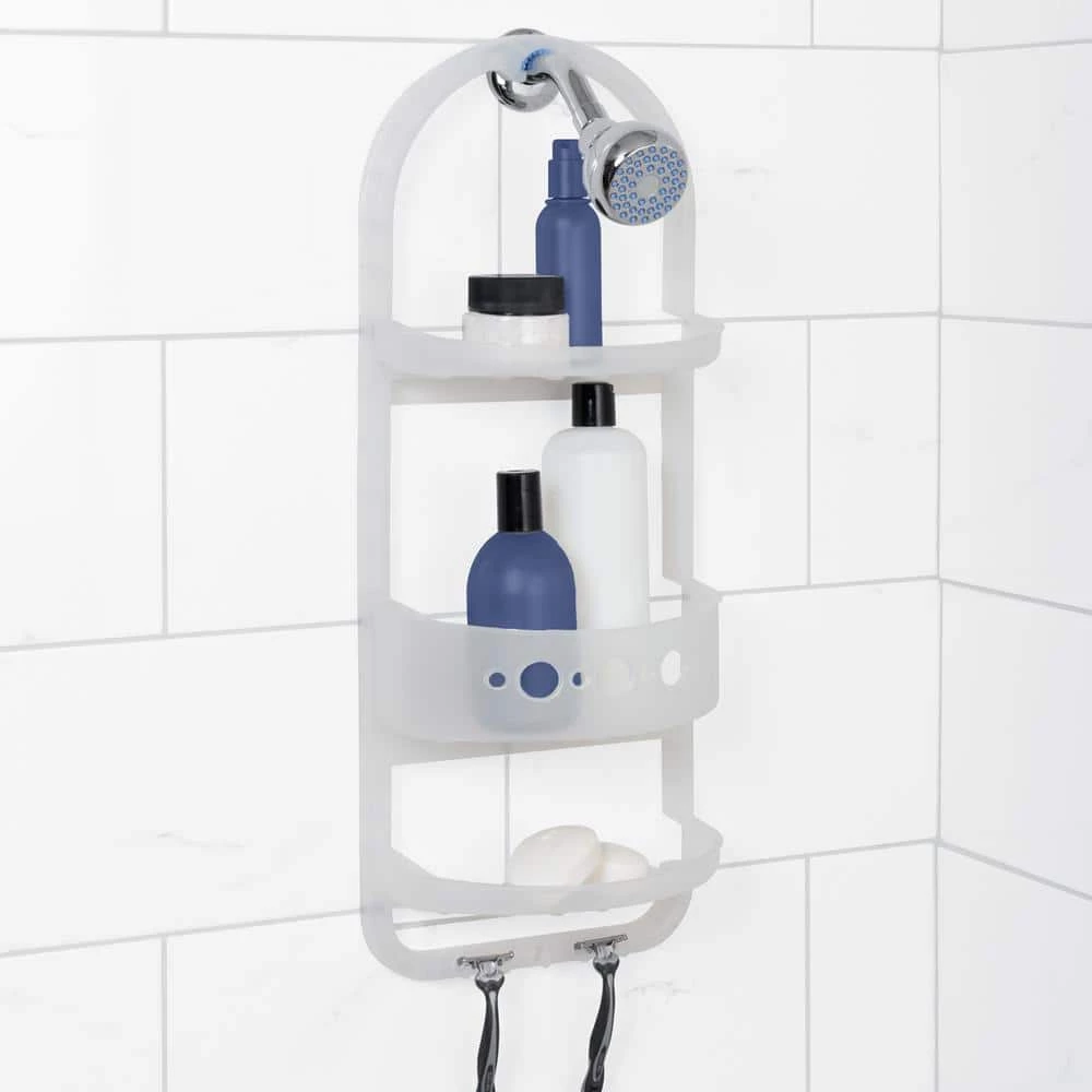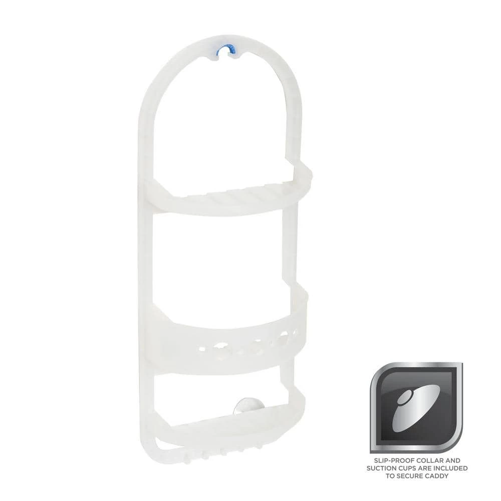 Instantly add more storage space to your bath with the Glacier Bay Large Over-the-Shower Caddy. This rustproof family-sized caddy has a frosted plastic finish and provides a deep basket and two shelves to keep bath essentials within easy reach. The self-draining shelves are easy to clean. (Simply wipe the caddy clean with a damp cloth.) Hooks along the bottom allow for storage of razors, poufs and more. The caddy installs easily over most standard showerheads, with no tools needed. Suction cups hold the caddy securely to prevent swaying or slipping. Glacier Bay customer care is available at 855-HD-GLACIER for additional questions
