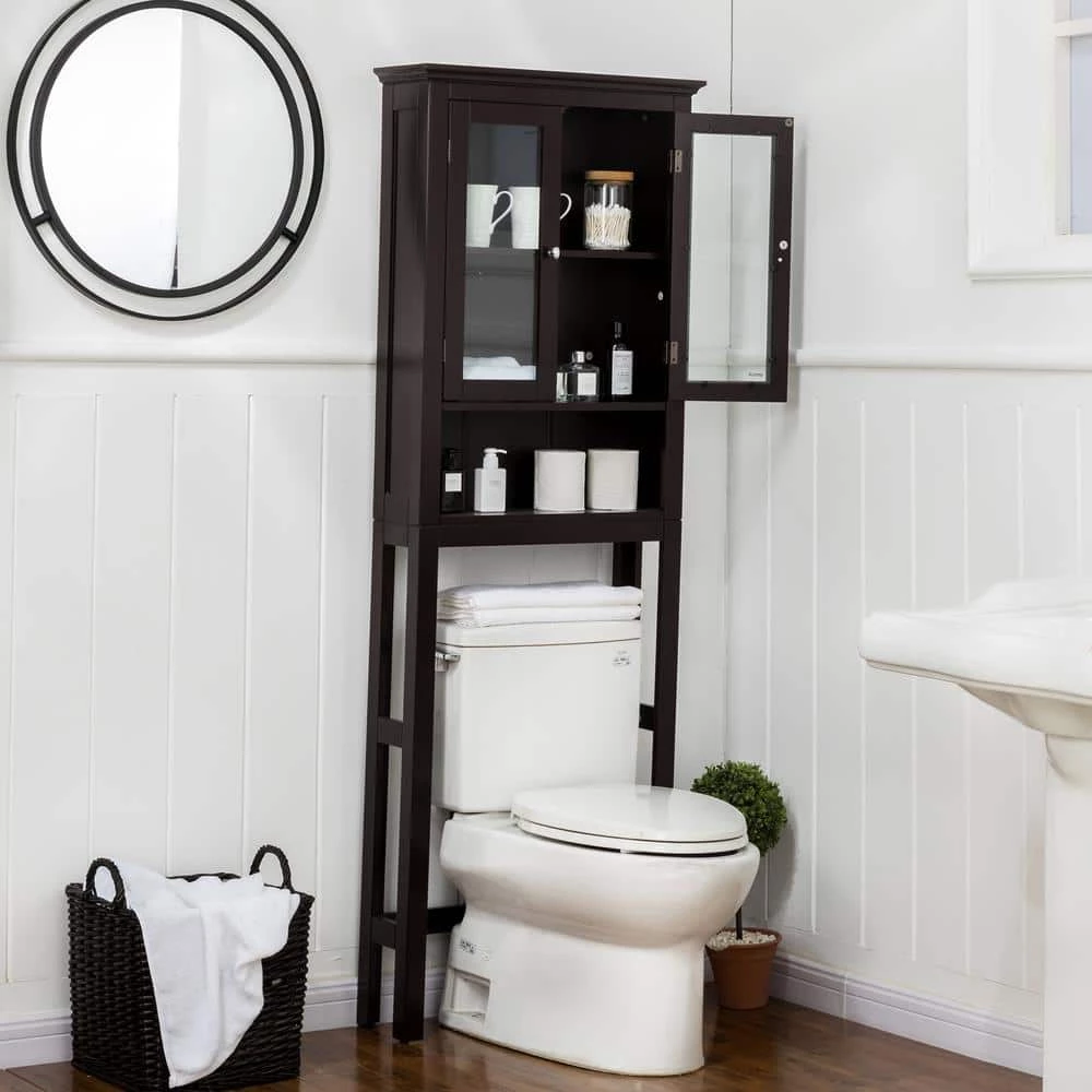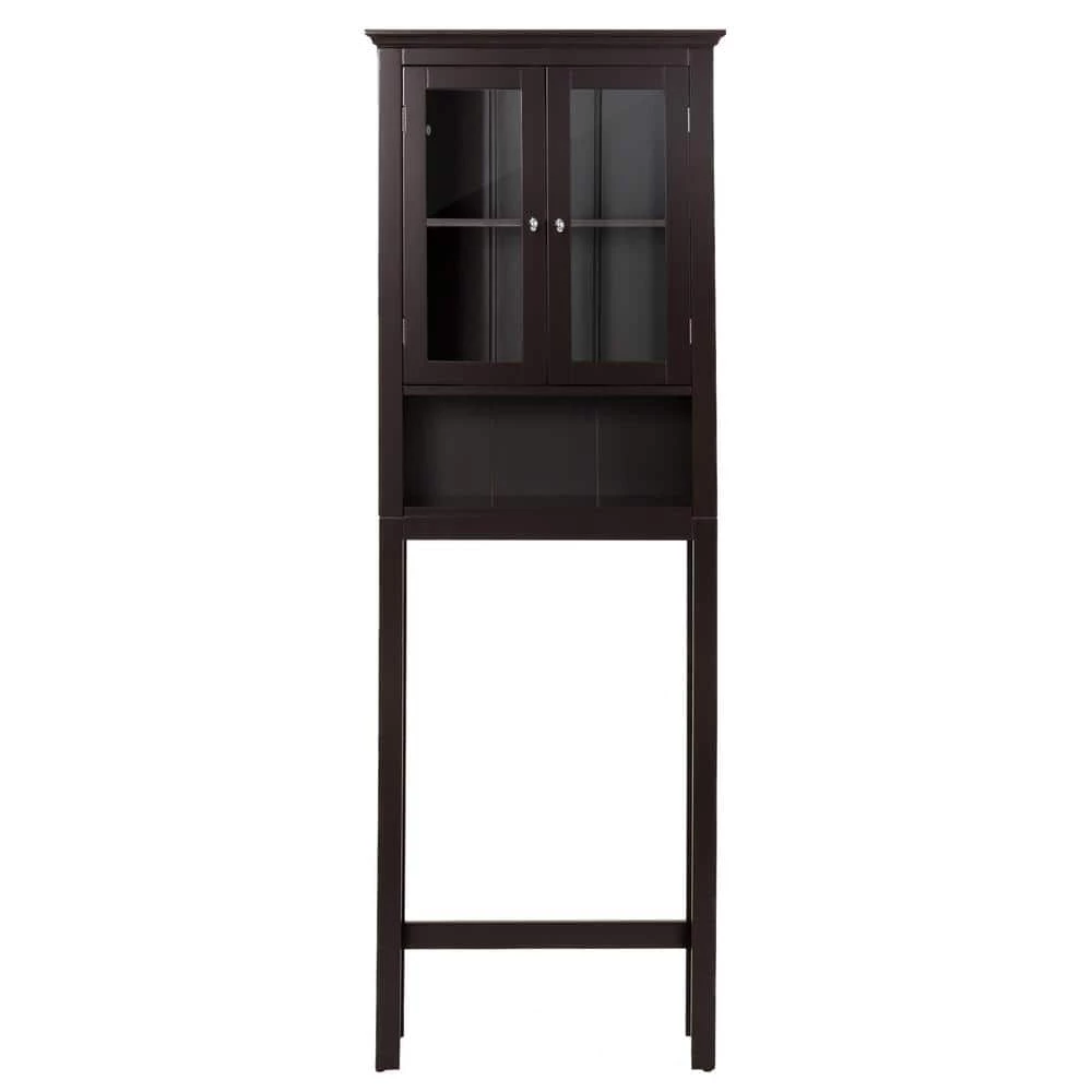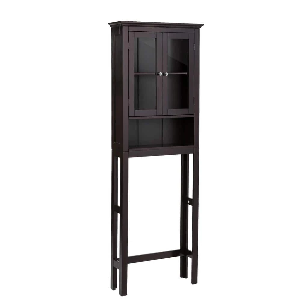 Open up the area in your bathroom with help from this spacesaver cabinet. Made with one cabinet and one open shelf, this over-the-commode unit gives you ample space for storing toiletries out of the way or adding a decorative touch to the room. This spacesaver cabinet boasts elegant appeal with an espresso finish, glass doors, and sleek handles.