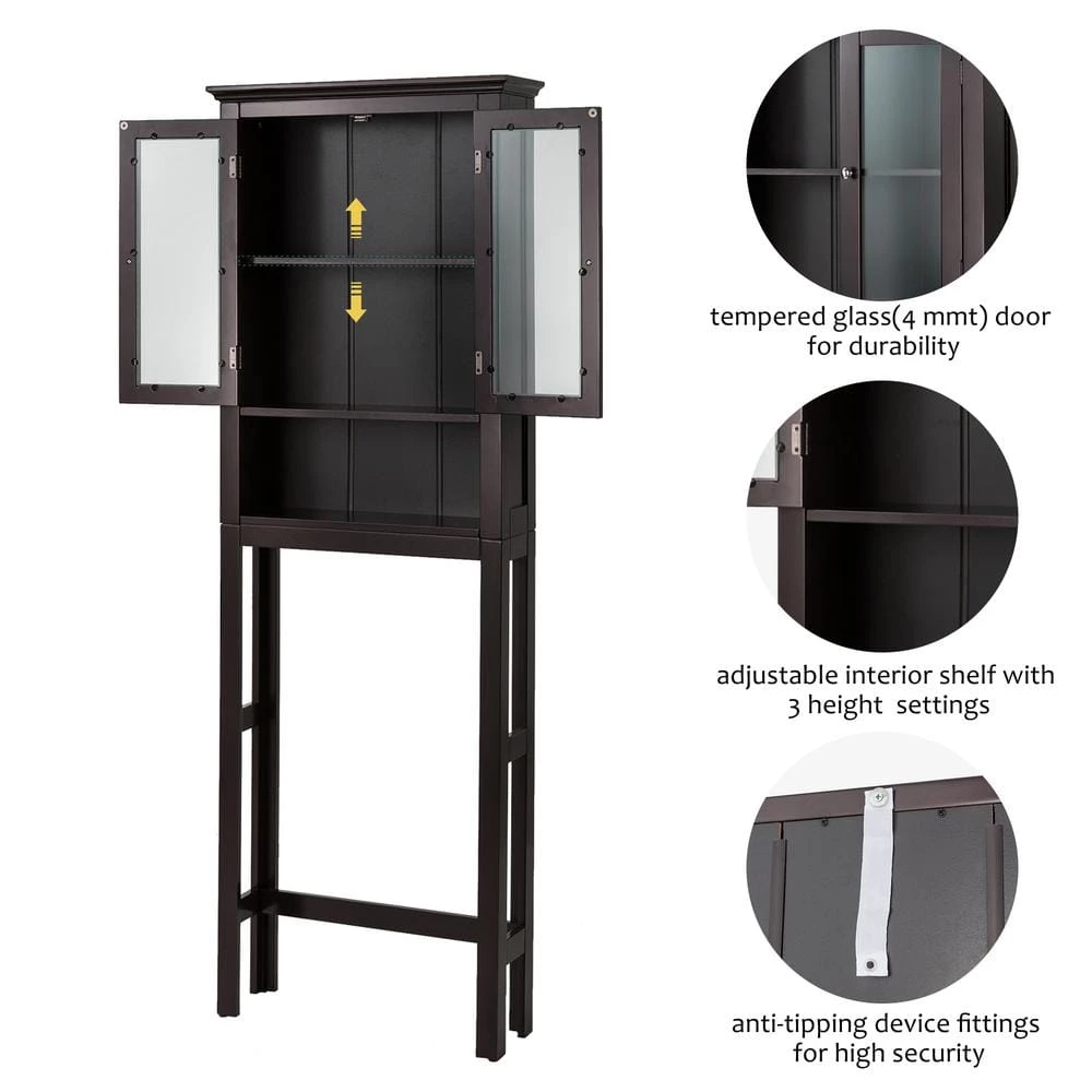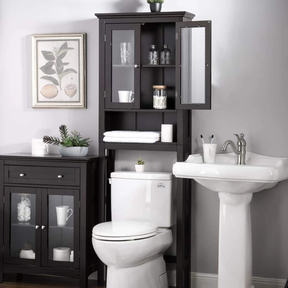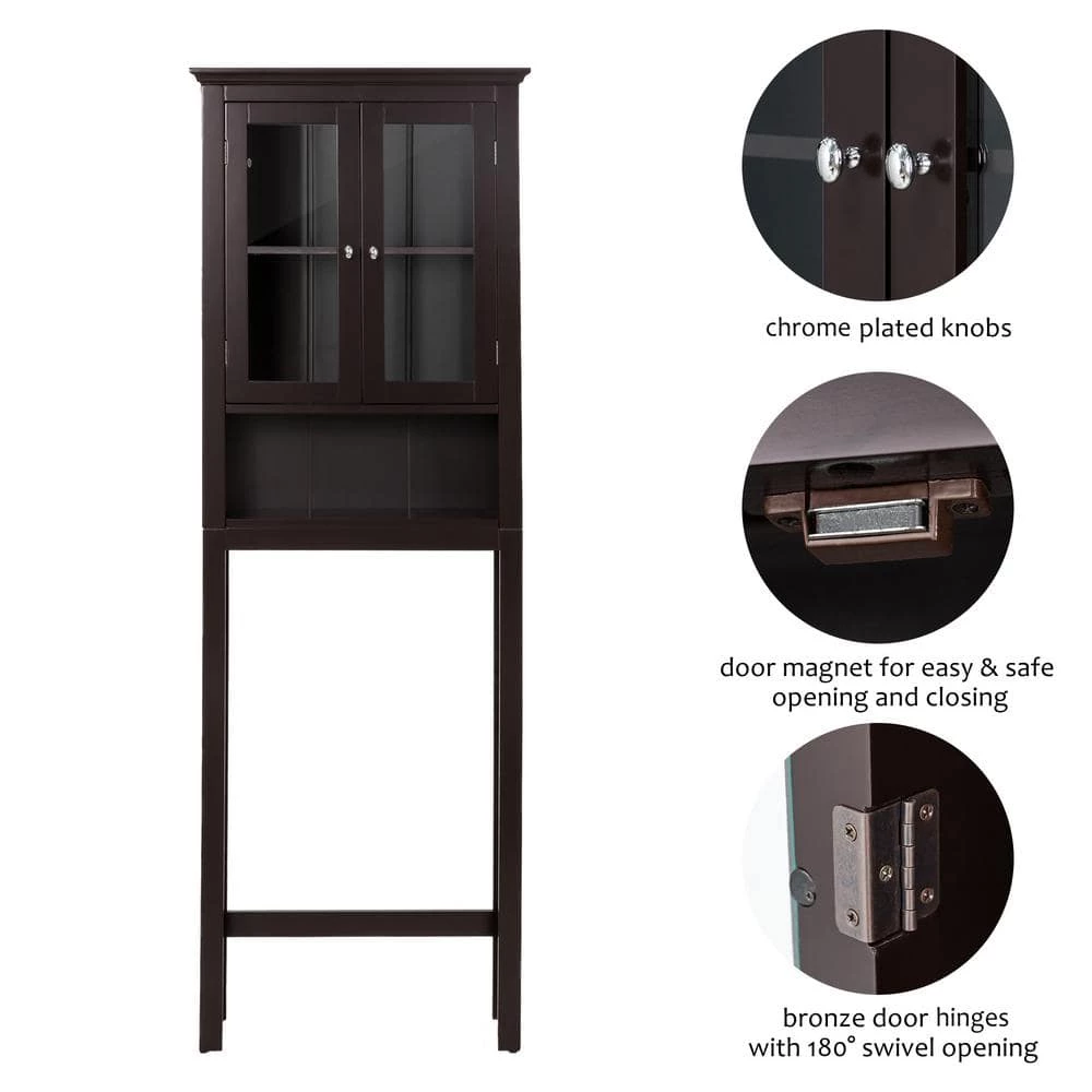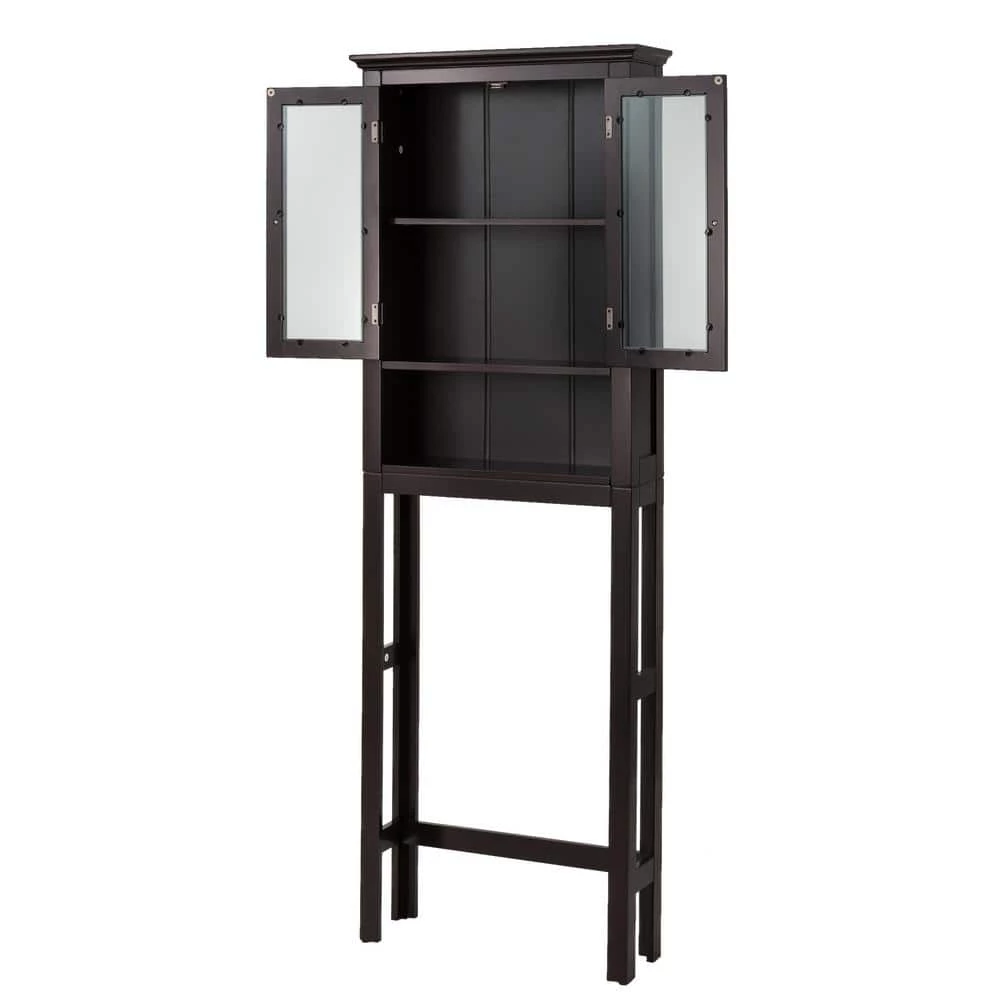 Open up the area in your bathroom with help from this spacesaver cabinet. Made with one cabinet and one open shelf, this over-the-commode unit gives you ample space for storing toiletries out of the way or adding a decorative touch to the room. This spacesaver cabinet boasts elegant appeal with an espresso finish, glass doors, and sleek handles.