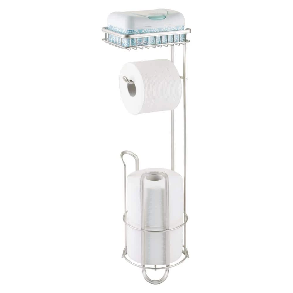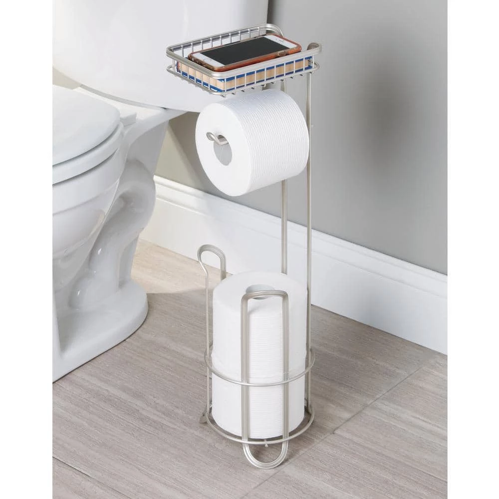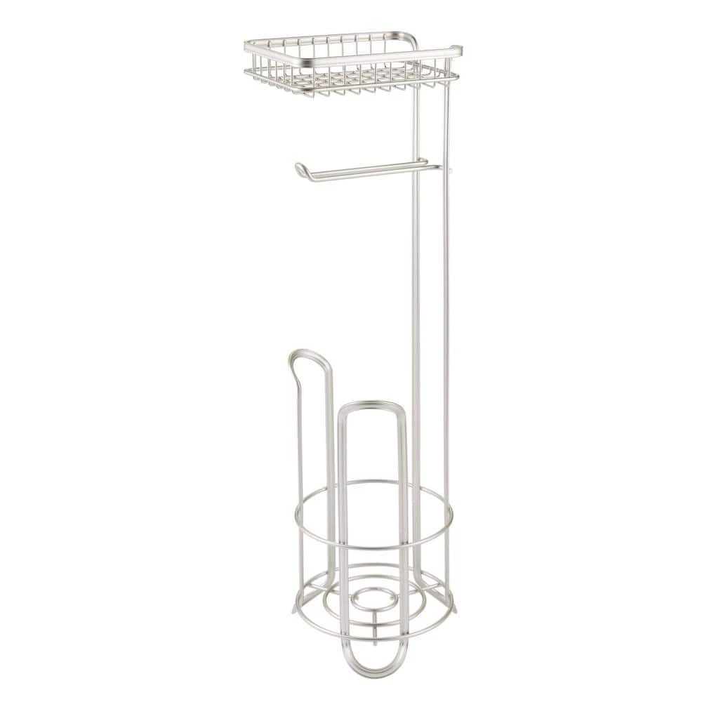 The iDesign York Roll Toilet Paper Reserve is the stylish and practical bathroom accessory you have been searching for. This holder allows you to dispense one roll and hold two additional rolls all in one convenient place. It features a shelf perfect for holding phones, wet wipes, and other small items. The free-standing design is compact and easy to fit in any space, whether it be in the corner of the room or between a sink and toilet. The satin silver finish is stylish and will fit in with any decor. Constructed of durable steel, this stand features a weighted base to keep the rolls off the floor. Measuring 6.4 in. x 8.12 in. x 24 in., the iDesign York Roll Toilet Paper Reserve will provide the organization you dream of in your bathroom. With iDesign by InterDesign, you can Live Simply every day.