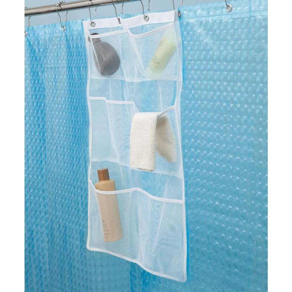 - This mesh pocket caddy has four metal grommet rings to hang from your shower curtain rod