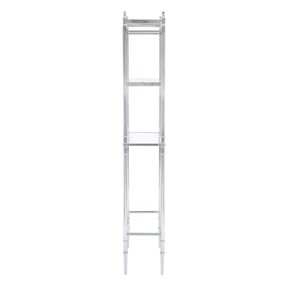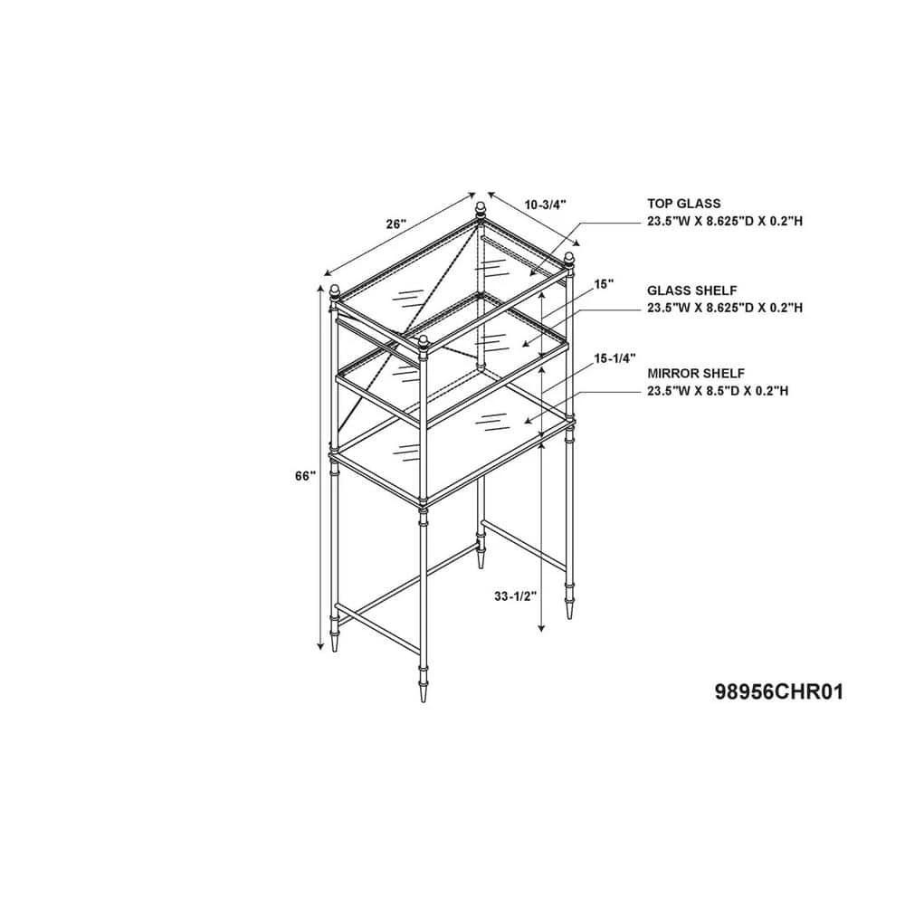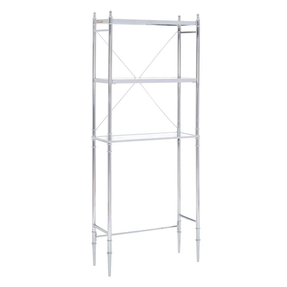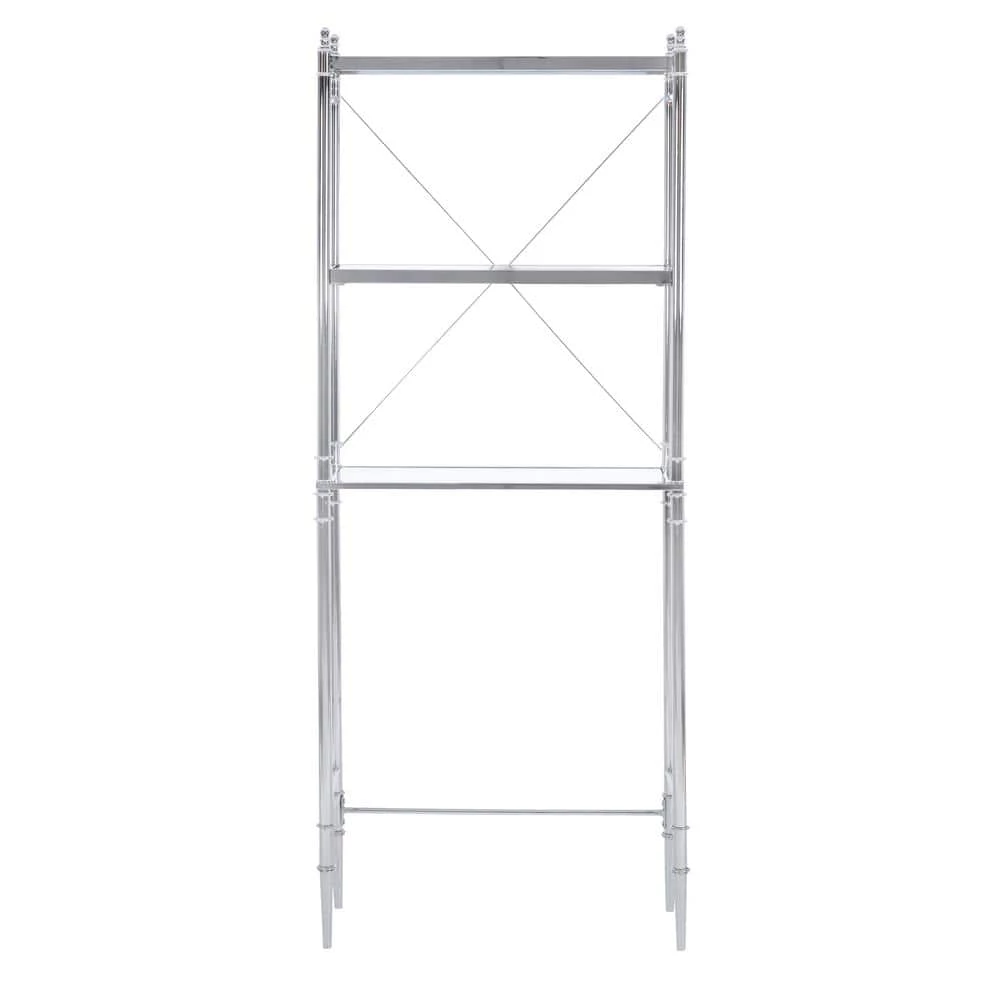 This Paramount Chrome Space-saver fits perfectly over most toilets and provides an elegant sense of storage space for your bathroom. This piece is ideal for those smaller bathrooms that need organization. The mirrored chrome metal finish gives off a hint of elegance. The three tiered shelves help keep your bathroom feeling spa like and organized. The X-framed design on the back of the cabinet give it that modern feel. This piece is ideal for any master or guest bathroom.