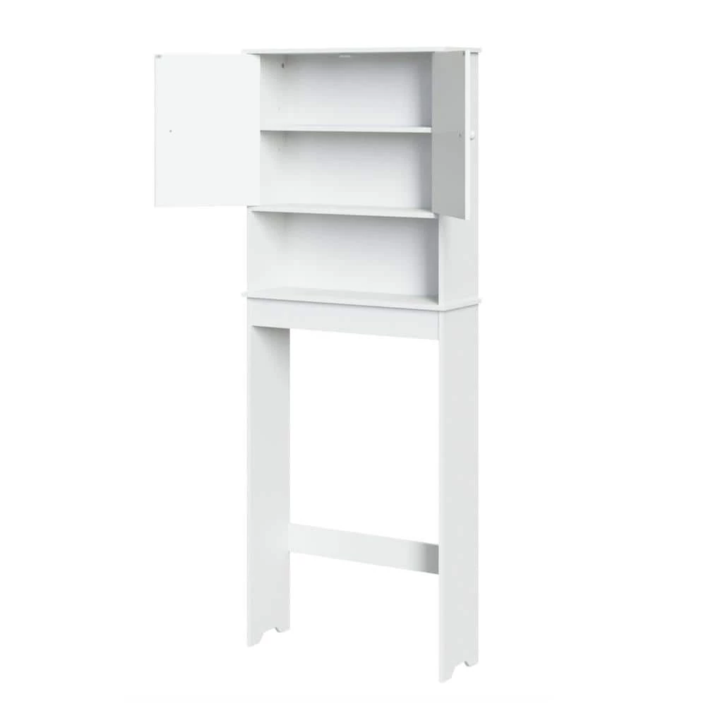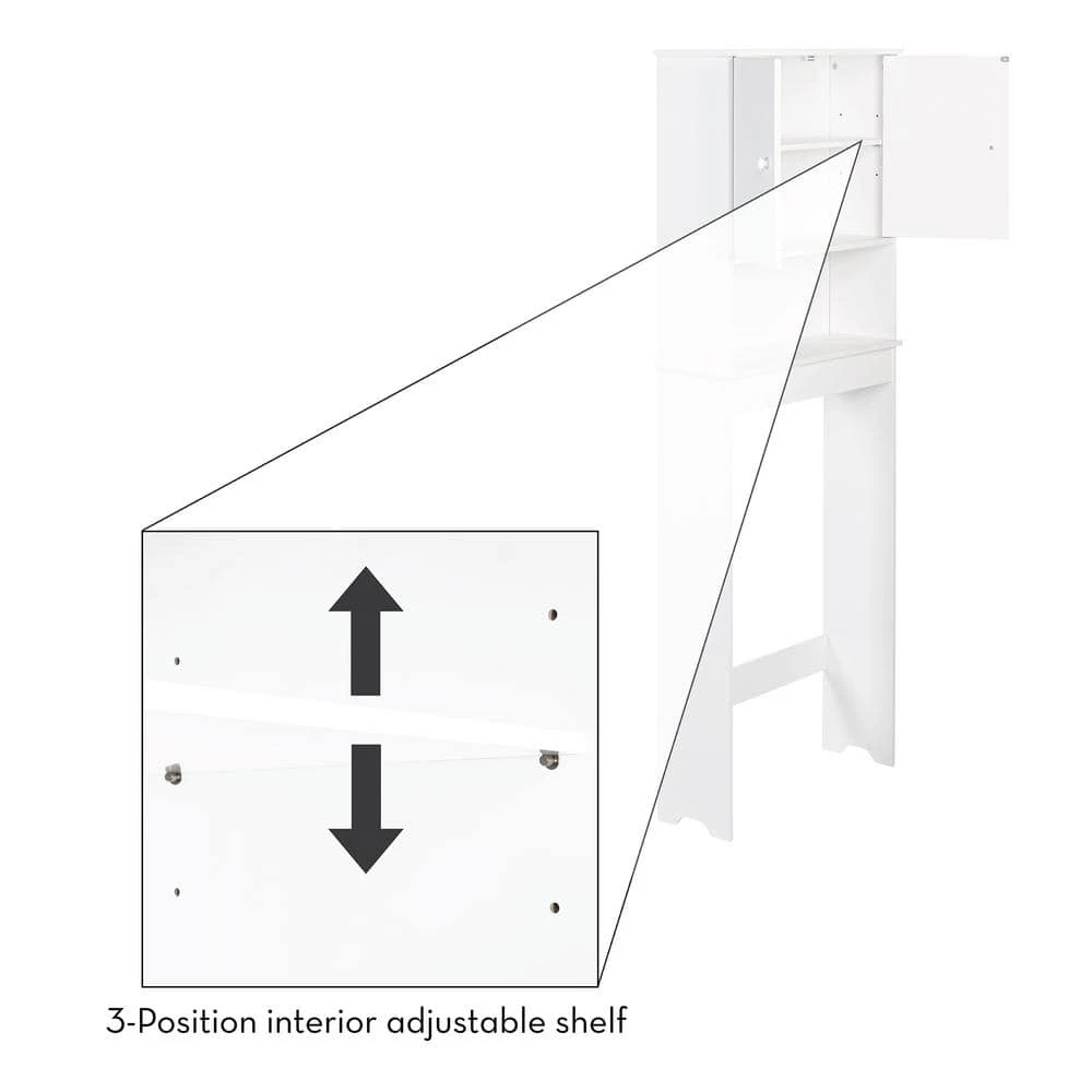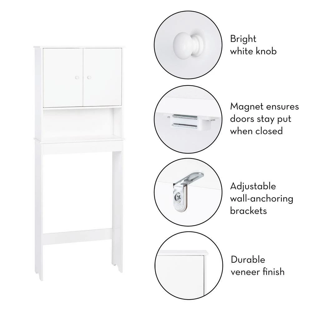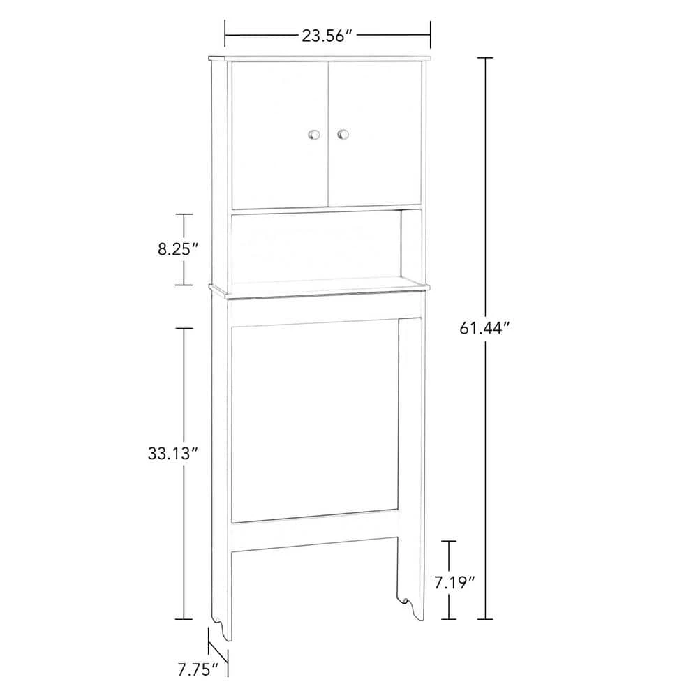 Hide away clutter and make the most of the limited space with this RiverRidge Two Door Over-the-Toilet Spacesaver. The upper cabinet with interior adjustable shelf is ideal for storing and concealing toilet paper or other everyday toiletries. The fixed open shelf and top shelf can be used for additional storage space or to add home decor items and charm to any bathroom. Additional dimensions: Inner Shelves: 21.81 in. W x 5.81 in. D; Open Shelf: 21.81 in. W x 7.13 in. D x 8.25 in. H; Space between floor and shelf: 36.13 in. H.