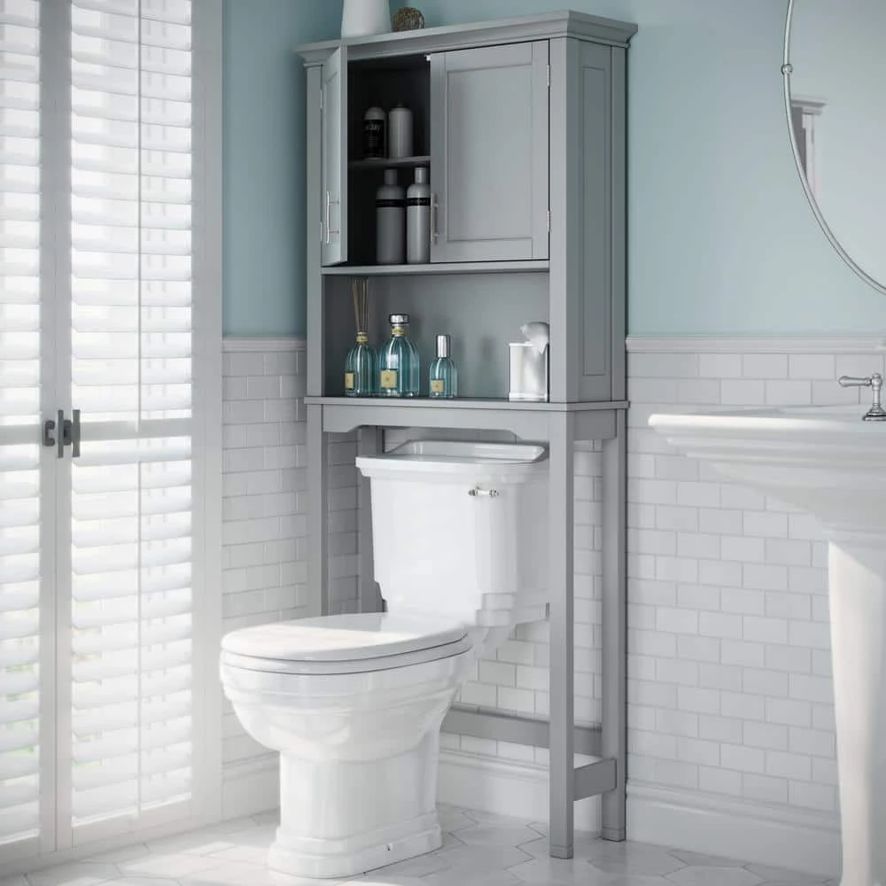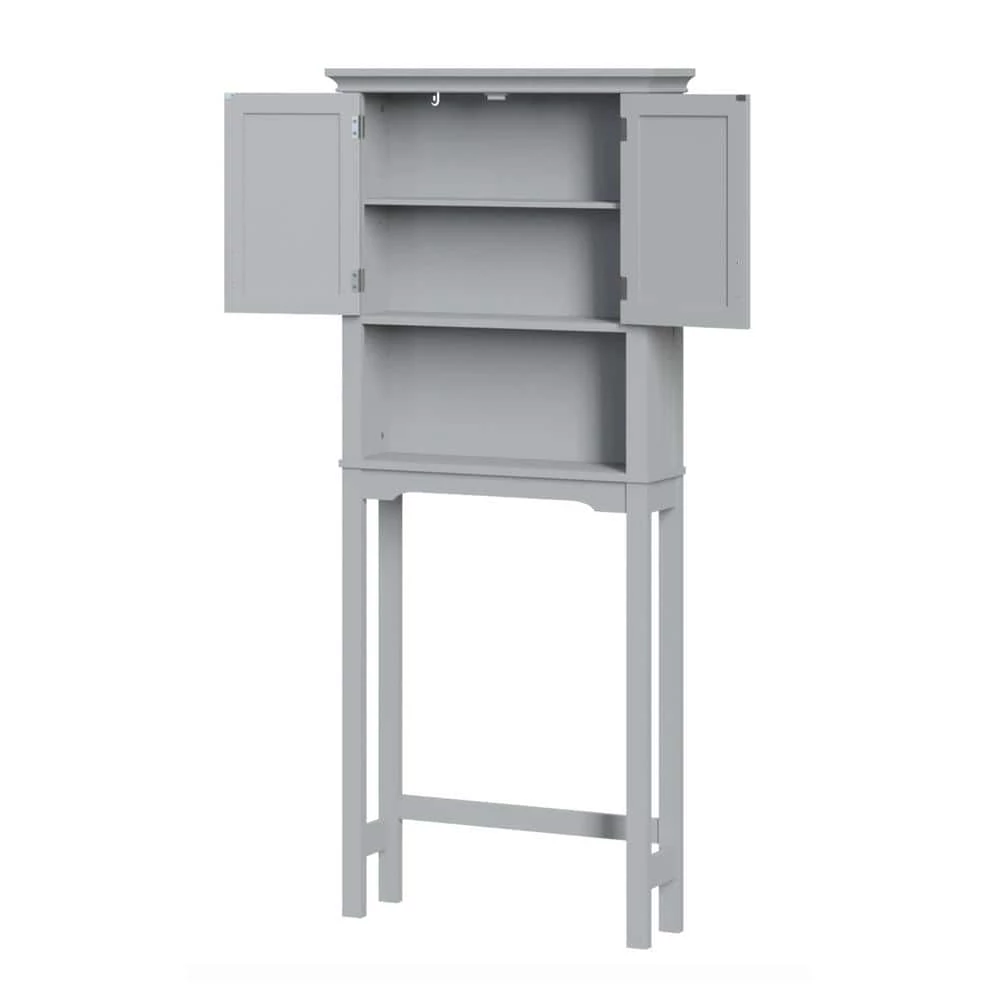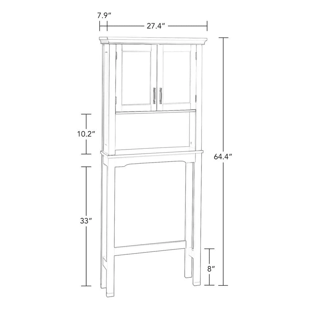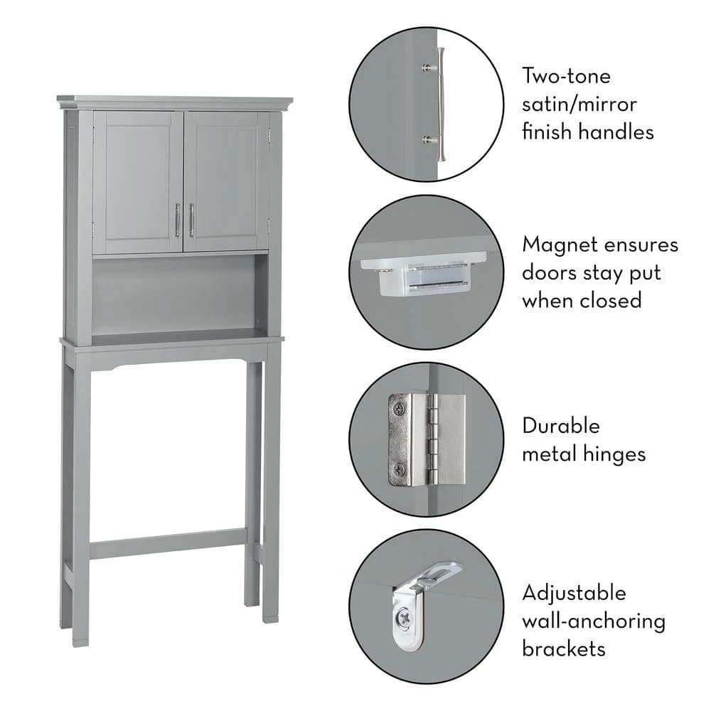 The RiverRidge Home Somerset Collection-Spacesaver Cabinet features classic design and attractive detailing, with inset doors and side panels, coved top shelf and two-tone satin/mirror finish handles. Traditional design complements many styles of decor. Available in white and gray finish.