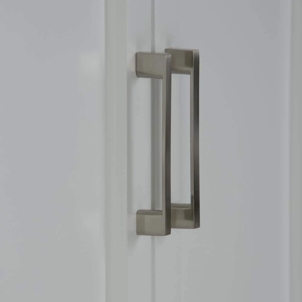 - Features one (1) door with two (2) adjustable interior shelves and one (1) open shelf. Contemporary Brushed Nickel handles