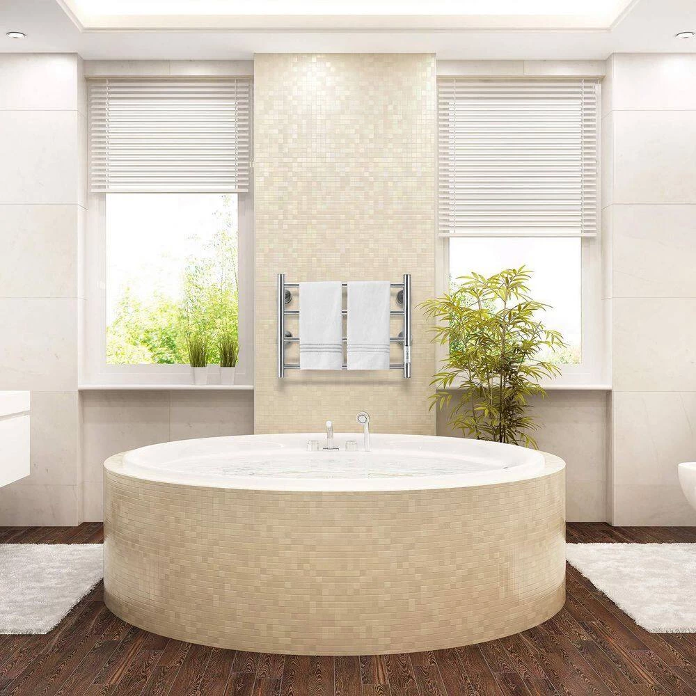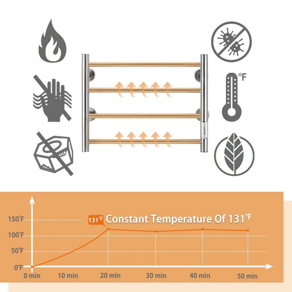 The 4-bar design heated towel rack provides a pleasant, comfortable heating or drying experience, especially during the colder months. Made of durable stainless steel, it is easy to clean and rust resistant. The towel warmer helps heat towels and dry them before use. This helps prevent mold and mildew. The surface temperature of the towel warmer will change with the surrounding temperature. Because this hot towel holder is very energy efficient, it is possible to power it on for a week and it does not consume electricity. The towel rack is the perfect towel heating solution for your home. [Easy Installation] Two plug-in and hard-wired options. Our bathroom heated towel rack is powered by hardwired or outlet power (plug-in) and is rated at AC 120V/60Hz with a 5.9ft power cord. All necessary hardware is included in the package and is easy to assemble.