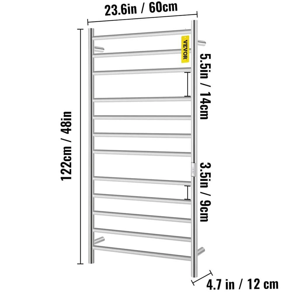 - Specifications: Model: VV-MJJRJ-12BP, Number of Bars: 12, Material: Stainless Steel, Finish: Polished, Voltage: 110 Volt, Power: 170 Watt, Mounting Type: Wall Mounted, Load Capacity: 11 lb., Temperature Range: 113-140 °F, Item Size(H x W x D): 48 x 23.6 x 4.7 in.