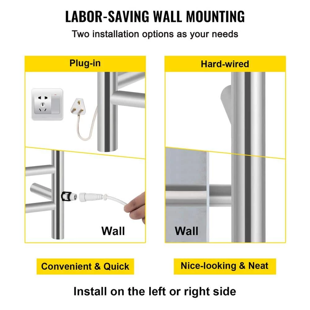 - Wall-mounted Installation: Our high-quality electric towel drying rack can be easily installed on the wall. If you want to make your wall looks neat, you can choose the hard-wired way to hide the cables. Otherwise, you will get an effortless setup by selecting a plug-in. Both left and right sides are designed for your assembly
