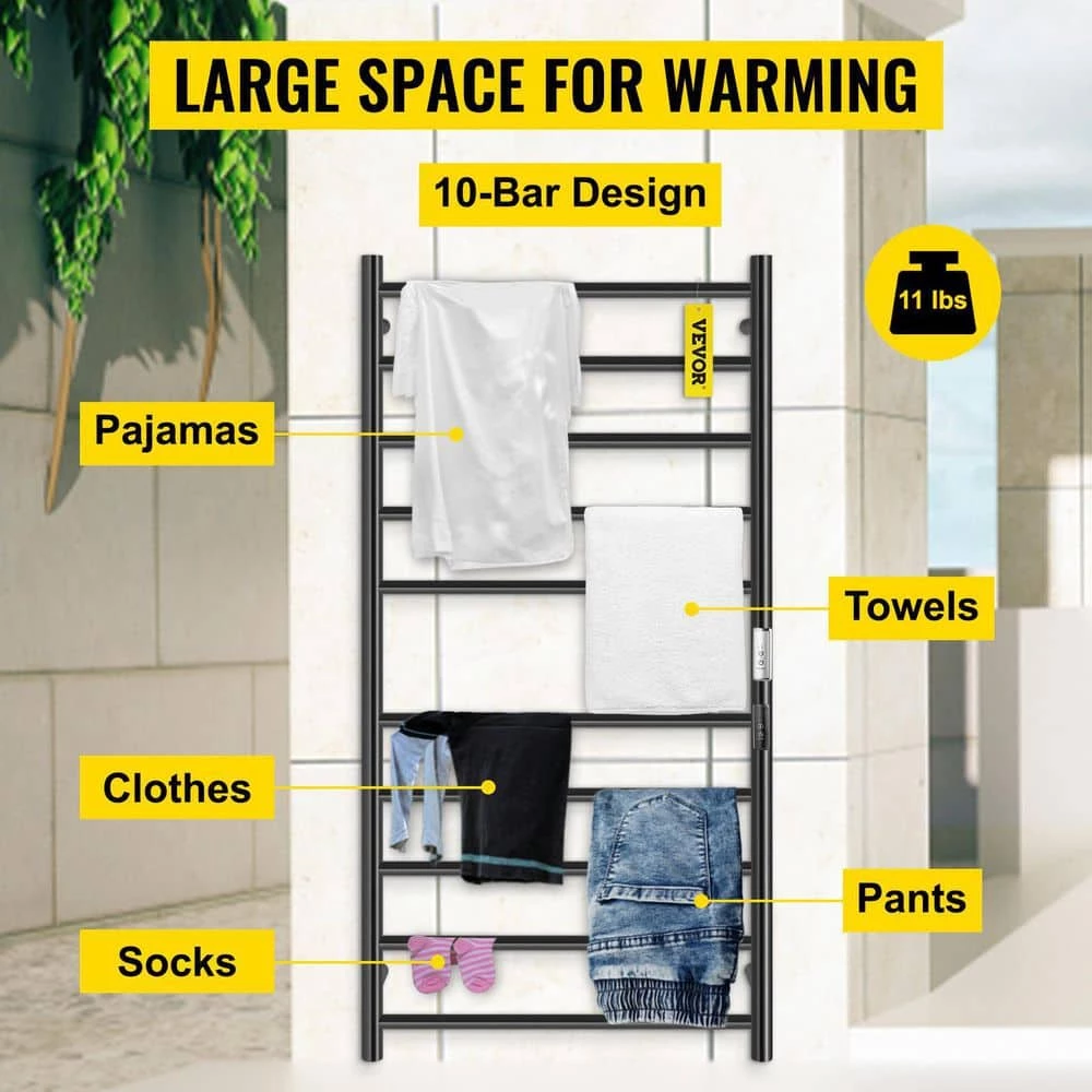 - Specifications:Model: VV-MJJRJ-10BF,Number of Bars: 10,Material: Stainless Steel,Finish: Powder Coated,Voltage: 110 Volt,Power: 140 Watt,Mounting Type: Wall Mounted,Load Capacity: 11 lbs/ 5 kg,Temperature Range: 113-140 °F/ 45-60 °C,Item Size(H x W x D): 47 x 23.6 x 4.7 in/ 118 x 60 x 12 cm