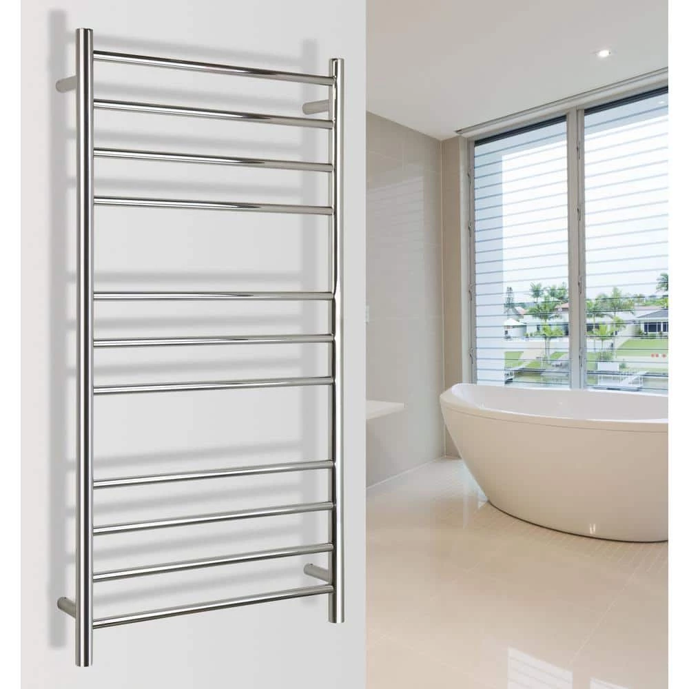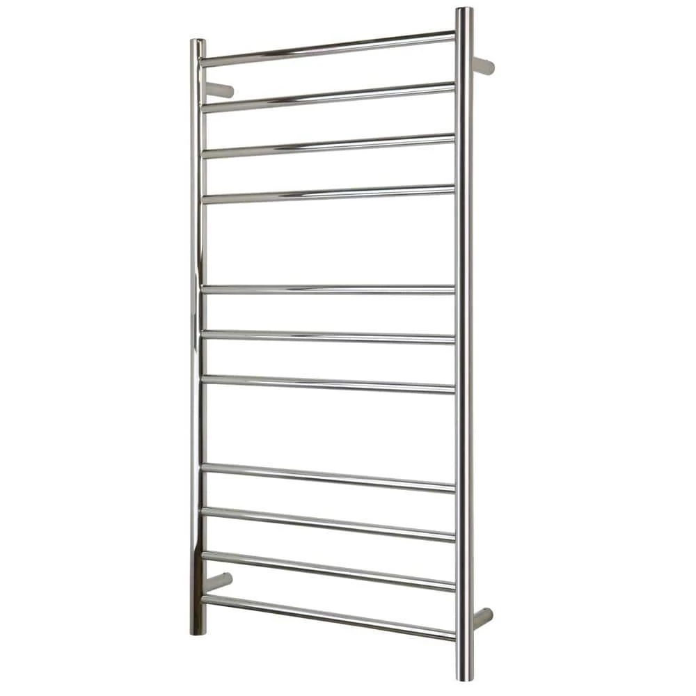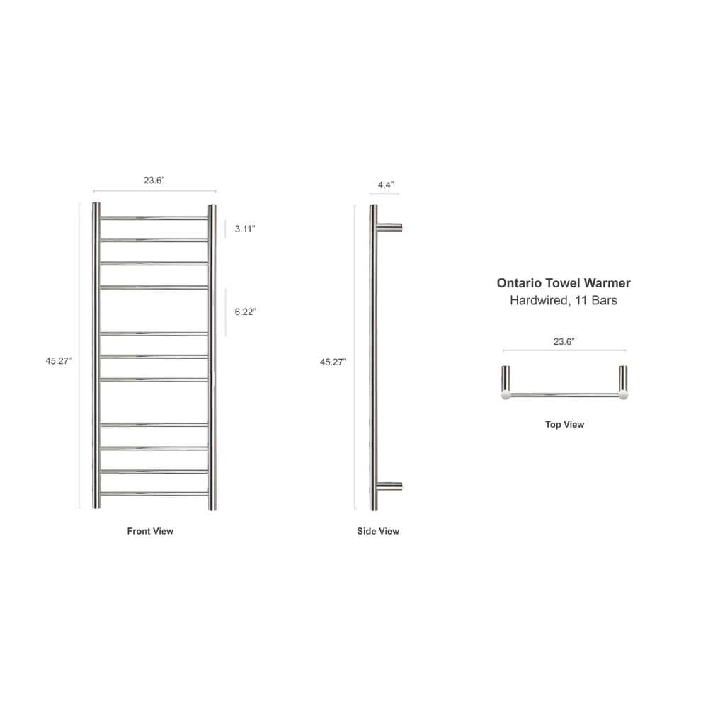 There’s no doubt that a towel warmer delivers comfort and luxury, but the Ontario XL from Warmly Yours is a perfect example of how functional an electric towel warmer can be. The economical Ontario XLs distinctive size offers two immediate benefits: it can easily accommodate multiple towels and its heat output of 444 BTUs per hour is hard to beat for the price. The heat is delivered through 11 round bars that are spaced in groups of 4, 3, and 4. This orientation makes the Ontario XL well suited for heating and drying towels of different sizes. The polished finish and hardwired connection of this model is both streamlined and aesthetically pleasing. This model comes with built-in TempSmart overheat protection to prevent the units surface temperature from exceeding 149°F (65°C).