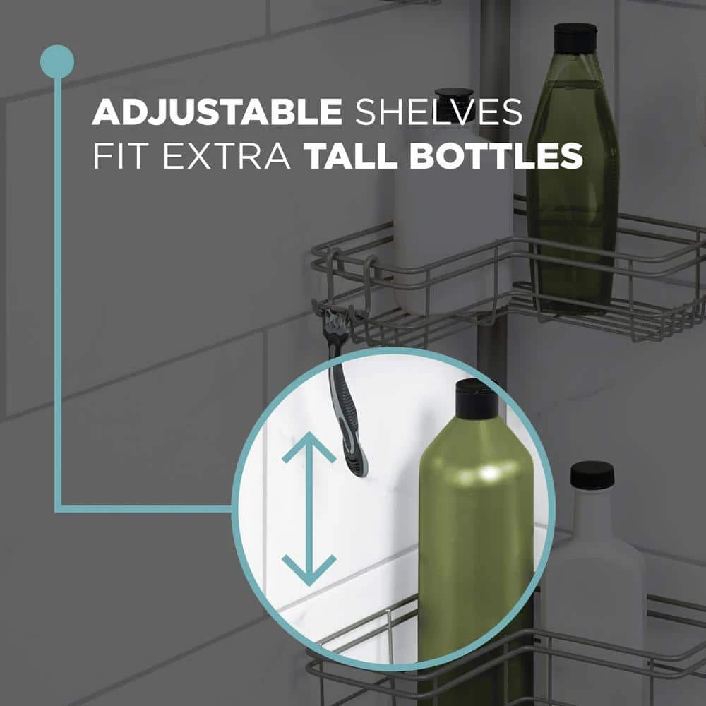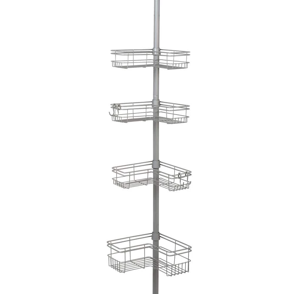 The Zenna Home Tension Pole Shower Caddy’s space-saving design has 4 L-shaped baskets that hug the corner of your shower area to maximize storage. This pole caddy easily adjusts to fit spaces from 60 in. up to a standard ceiling height of 97 in. The pole caddy features easy, tool-free assembly and installation. The rust-resistant tension caddy has an attractive satin nickel finish.
