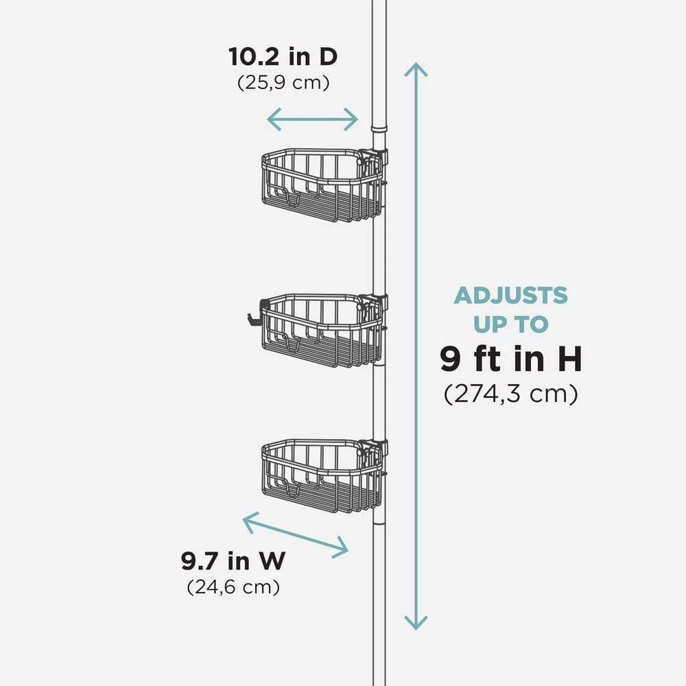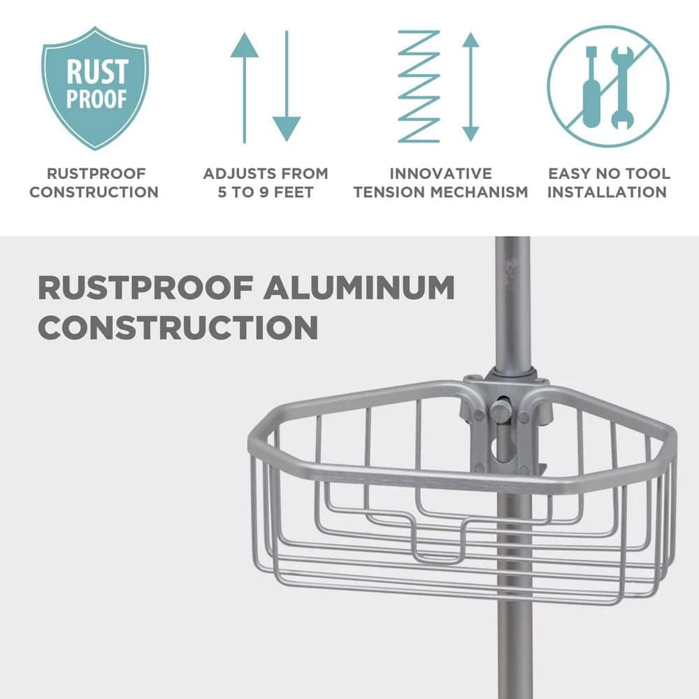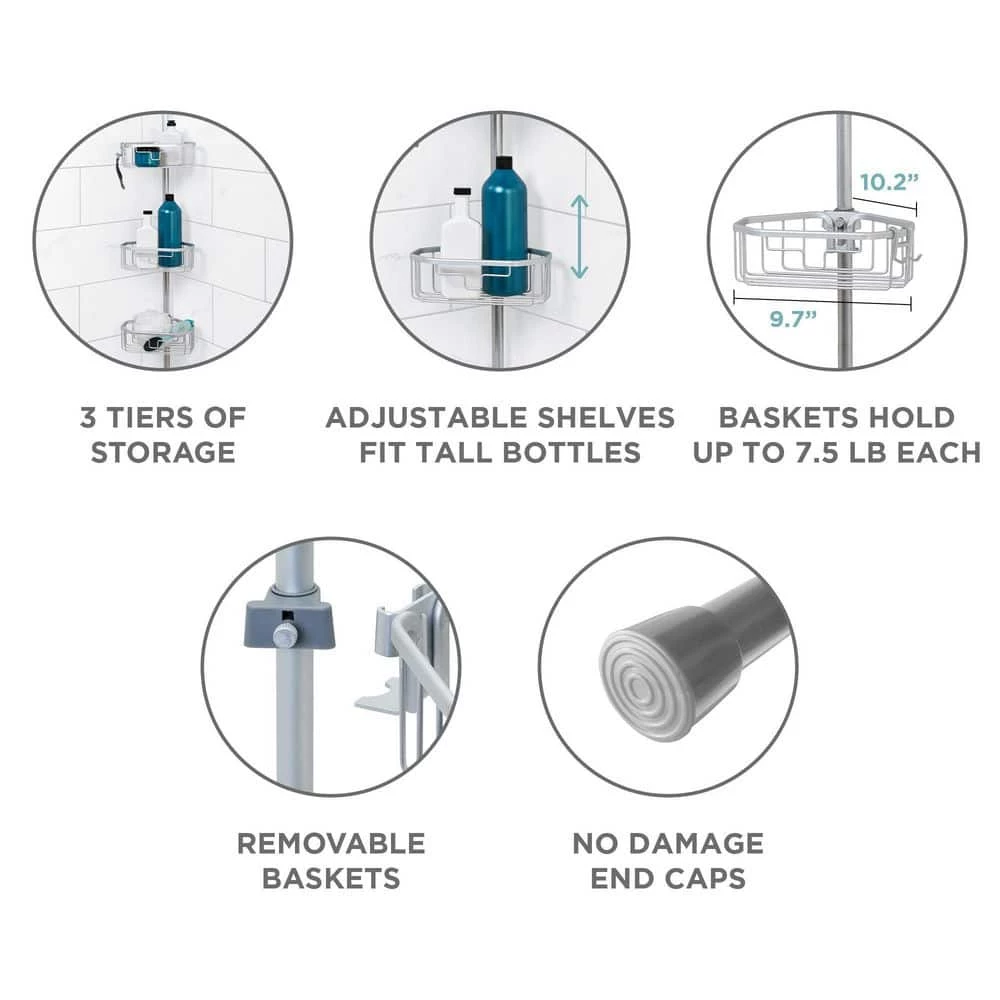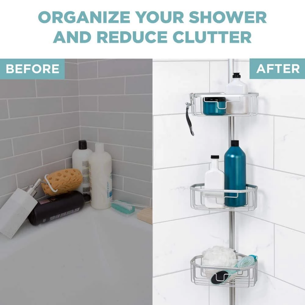 The NeverRust Aluminum Tension Corner Shower Caddy adds rustproof storage into the corner of any bath or shower area. Installation is easy and tool-free, thanks to the shower caddy’s innovative continuous tension technology system. The caddy has 3-adjustable (and removable) baskets for storing bottles and other bath and shower accessories. The caddy fits in the corner of most tub or shower spaces and is adjustable up to 9 ft. high.