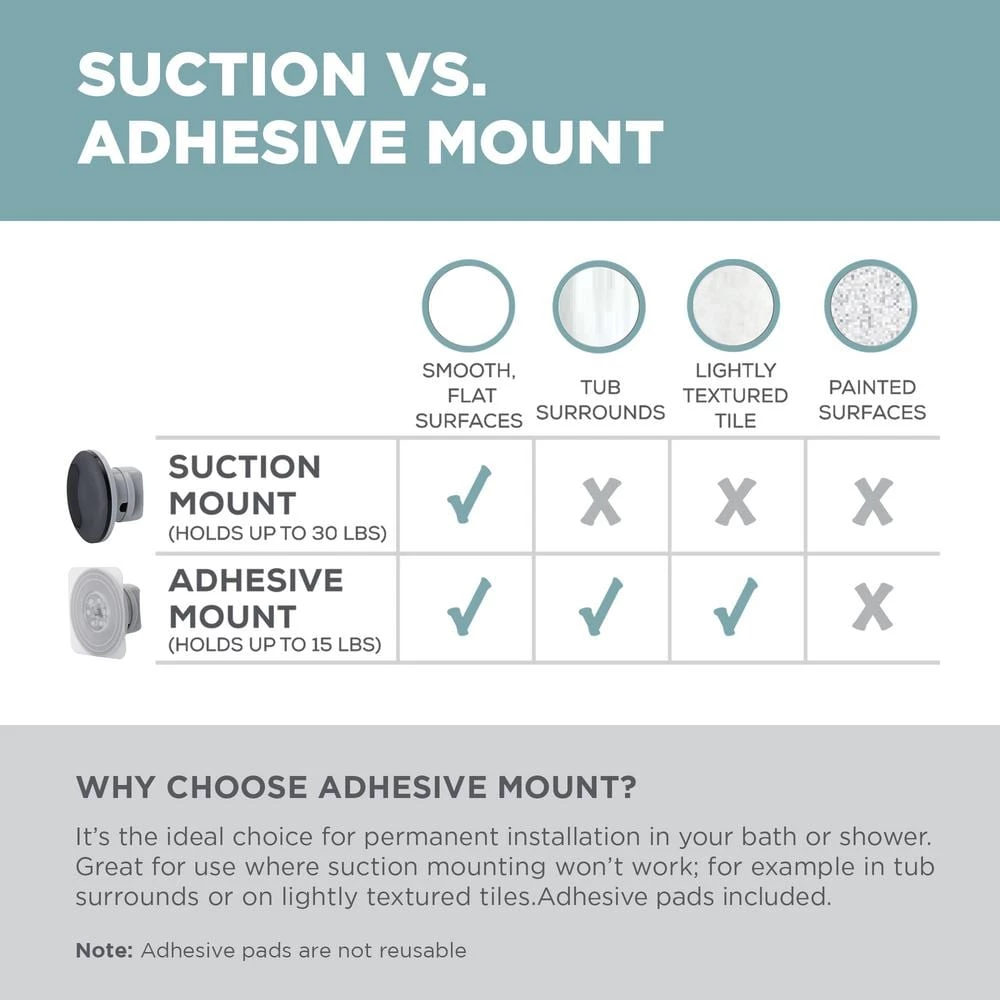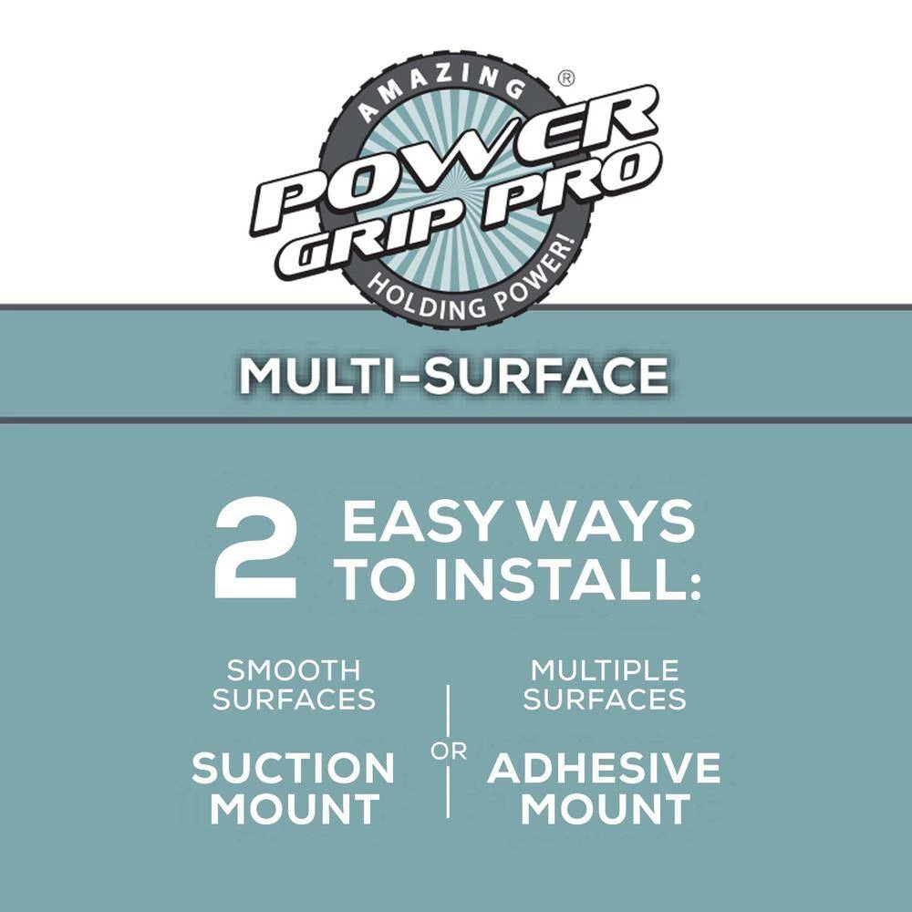 - Dual mount design lets you choose between power grip pro suction or adhesive-mount installation